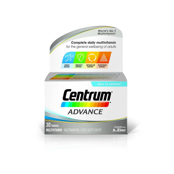 Centrum Advance is a comprehensive daily multivitamin and multimineral supplementWith balanced nutrient combinationsSupplements your diet and lifestyle by containing essential vitamins and minerals recommended on a daily basisVitamins B1, B2, B5, B6 and minerals phosphorus and magnesium help release energy from food to contribute to your overall health and well-beingContains vitamins A and Biotin to help healthy skin and vitamin C, which contributes to the normal function of the immune system