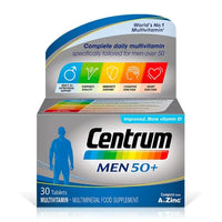 Centrum men 50+ is a multivitamin specially formulated for men over the age of 50. It is a complete multivitamin which contains 24 key nutrients including all 13 essential vitamins. This vitamin supports men over 50's nutritional support as well as helping many areas such as immune system, eye health and heart function.