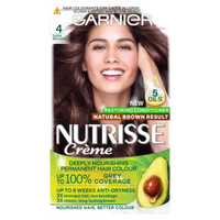 Garnier Nutrisse Crème permanent nourishing brown hair dye allows you to dye your hair in the comfort of your home, giving you rich natural-looking and long lasting brown hair colour with up to 100% grey hair coverage. With Nutrisse permanent hair dye, nourished hair means better colour. Our after colour hair conditioner is enriched with avocado oil, olive oil, cranberry oil, and shea oil which nourishes hair even after colouring leaving it silky, 3x shinier** and protected against dryness for up to 8 weeks