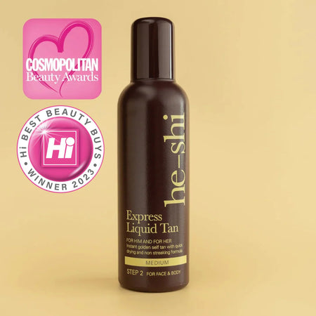 Meet our award-winning He-Shi Express Liquid Tan. Winner of Cosmopolitan's "Best Self Tanning Product", this incredibly hydrating, lightweight liquid formula gives a medium tan lasting 7 to 10 days.