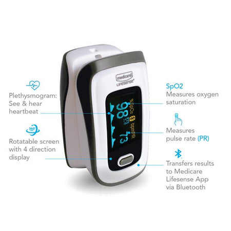 The Medicare LifeSense Bluetooth Pulse Oximeter is an easy to use, non-invasive and completely painless SpO2 test which gives you quick and accurate results within 10 seconds. The purpose of our Bluetooth Pulse Oximeter is to measure SpO2 levels. The Bluetooth feature allows you to link the device to our Medicare LifeSense App.
