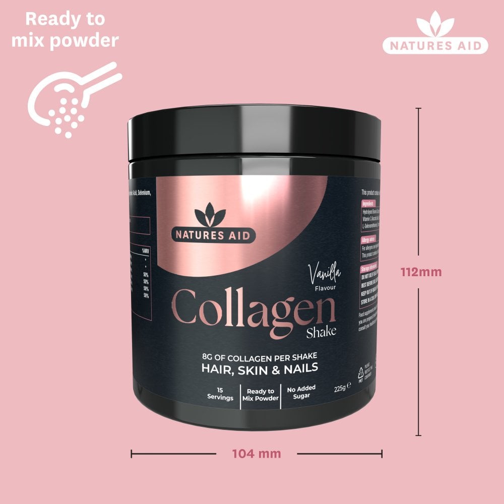Natures Aid Vanilla Collagen Shake contains hydrolysed bovine collagen peptides with added hyaluronic acid, selenium, biotin and vitamin c for optimal hair, skin and nail support.