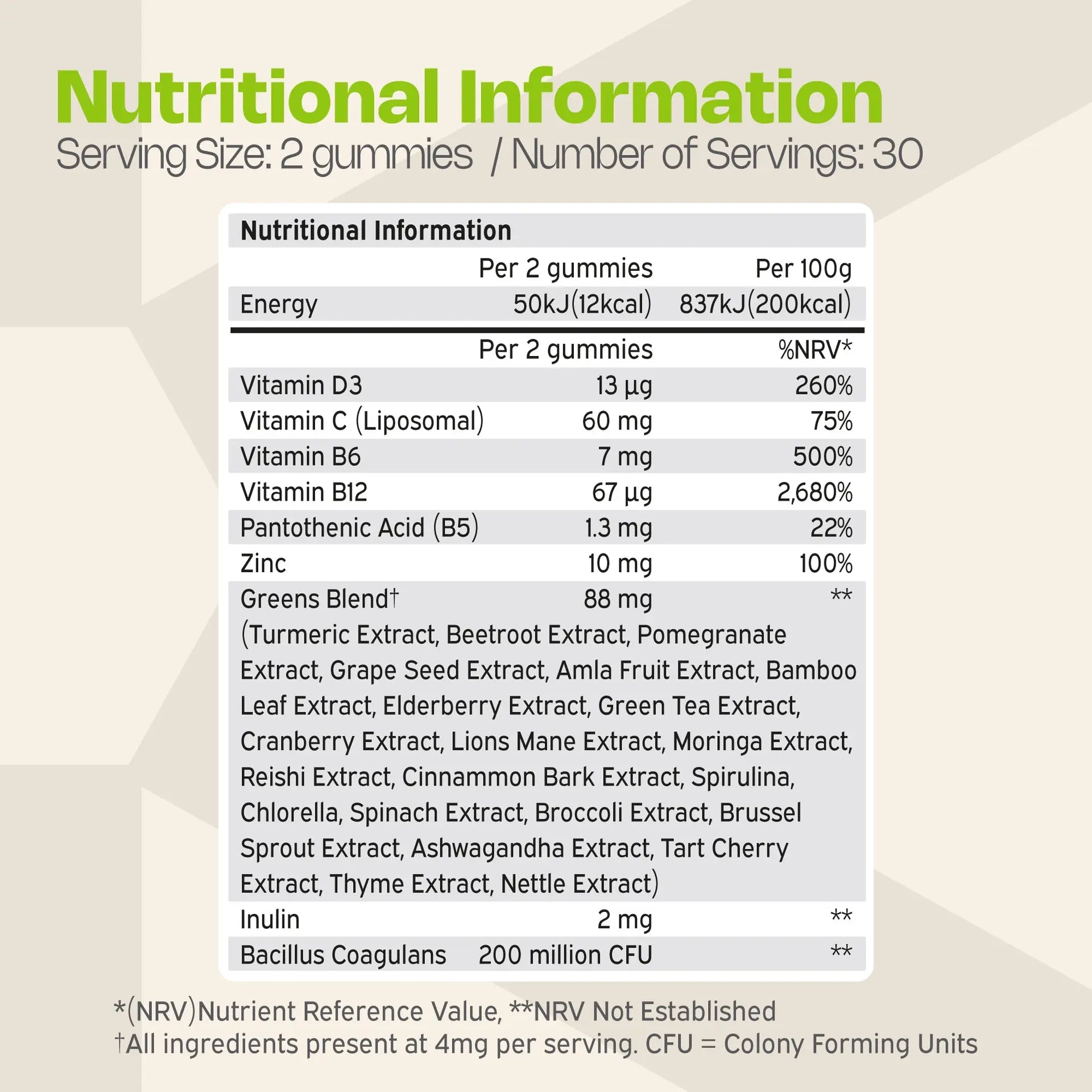 Nutriburst NutriGreens is a daily food supplement in gummy form, containing a blend of 22 fruits, vegetables, herbs and mushrooms, together with essential vitamins, zinc, inulin and live bacterial cultures to support everyday health.