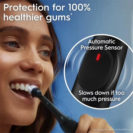 An automatic gum pressure sensor protects your gums by slowing down the brushing speed and signaling with a red light when you brush too hard, ensuring a gentle yet effective clean.