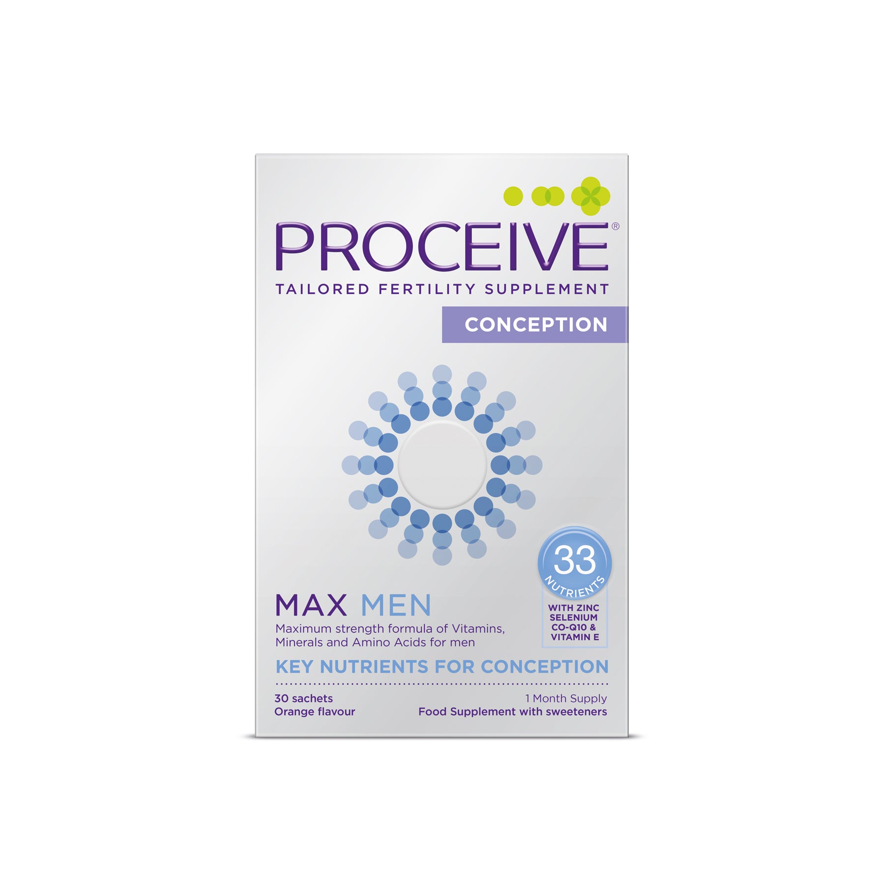 Proceive Max Men is a premium nutritional supplement formulated to support men's daily wellness needs. Each box contains 30 easy-to-use sachets, designed to be mixed with water or juice for convenient daily use.