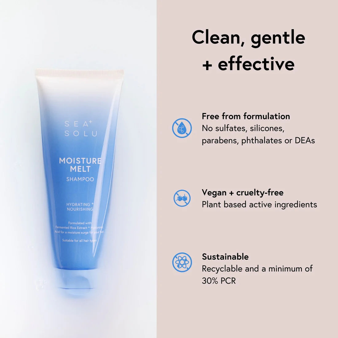 SEA+SOLU's Moisture Melt Shampoo is an ultra-hydrating, sulfate-free shampoo combining strengthening proteins and rich emollients to deeply nourish and protect dry, damaged hair. Ideal for all hair types. It restores moisture, repairs damage, and prevents future breakage. Vegan and cruelty-free.